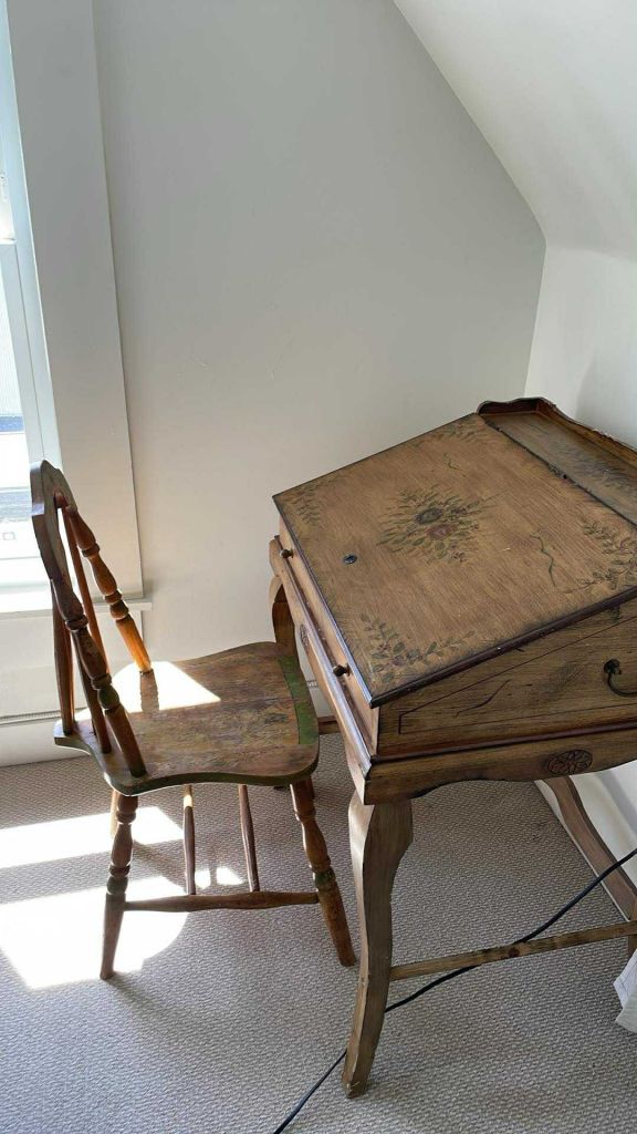 I think this is why I like vintage things. I bought an old desk from Facebook Marketplace recently. It’s a secretary desk. The lid opens up. I love its rickety legs, (slightly) broken chair, and its scuffed exterior. I wonder who used to use it. A child, I think, because there are paint streaks on the underside–red flecks and lime green glitter. I’m trying to be conscious about what decor I bring into my space these days. I like old things because they remind me of what it means to exist beyond the chaos of your times.